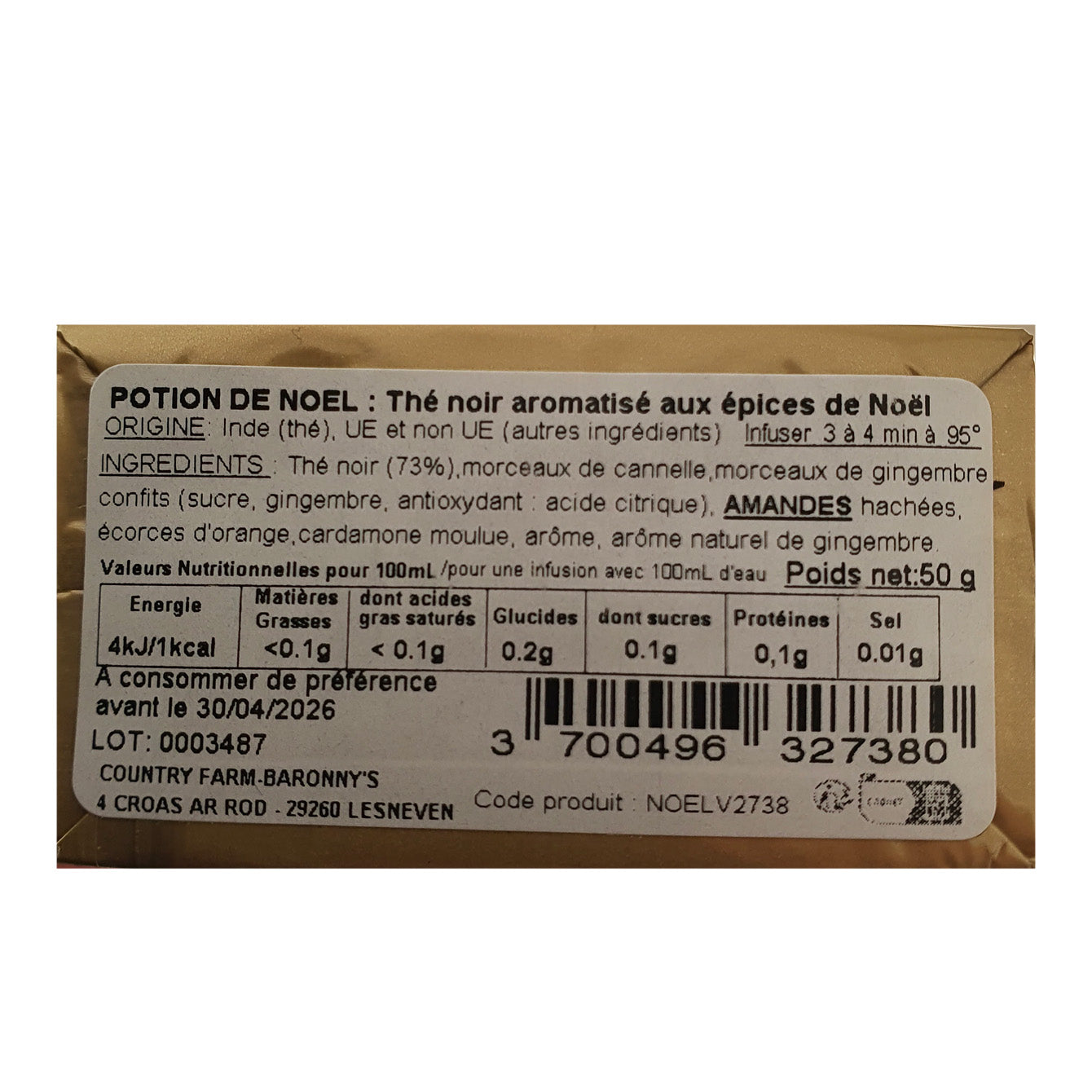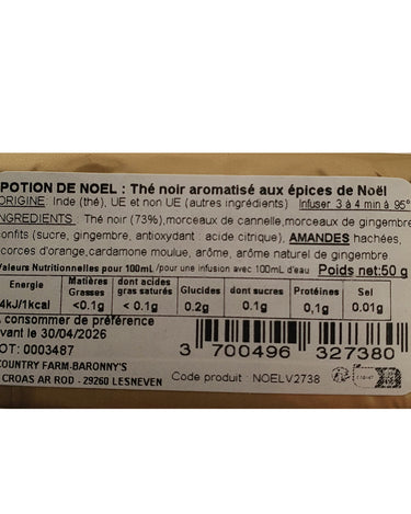 Ingrédients : thé noir (73%), morceaux de cannelle, morceau de gingembre confits (sucre, gingembre, antioxydant : acide citrique), amandes hachées, écorces d’orange, cardamone moulue, arôme, arôme naturel de gingembre.