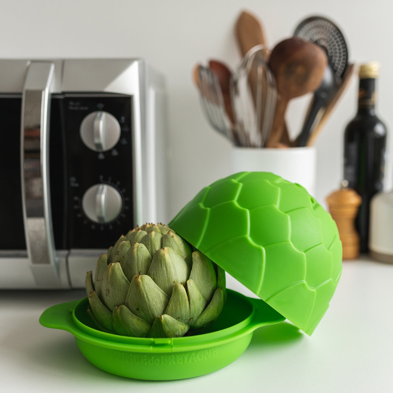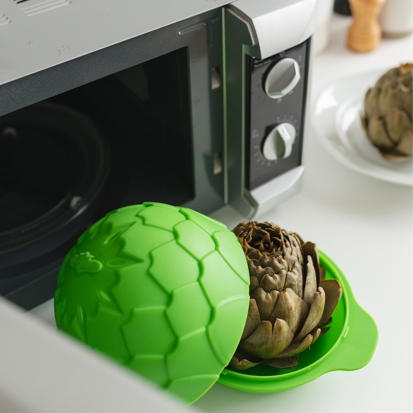 Déposer l'artichaut encore humide dans la coupelle, clipper la cloche dessus et mettre l'ensemble au micro-ondes.